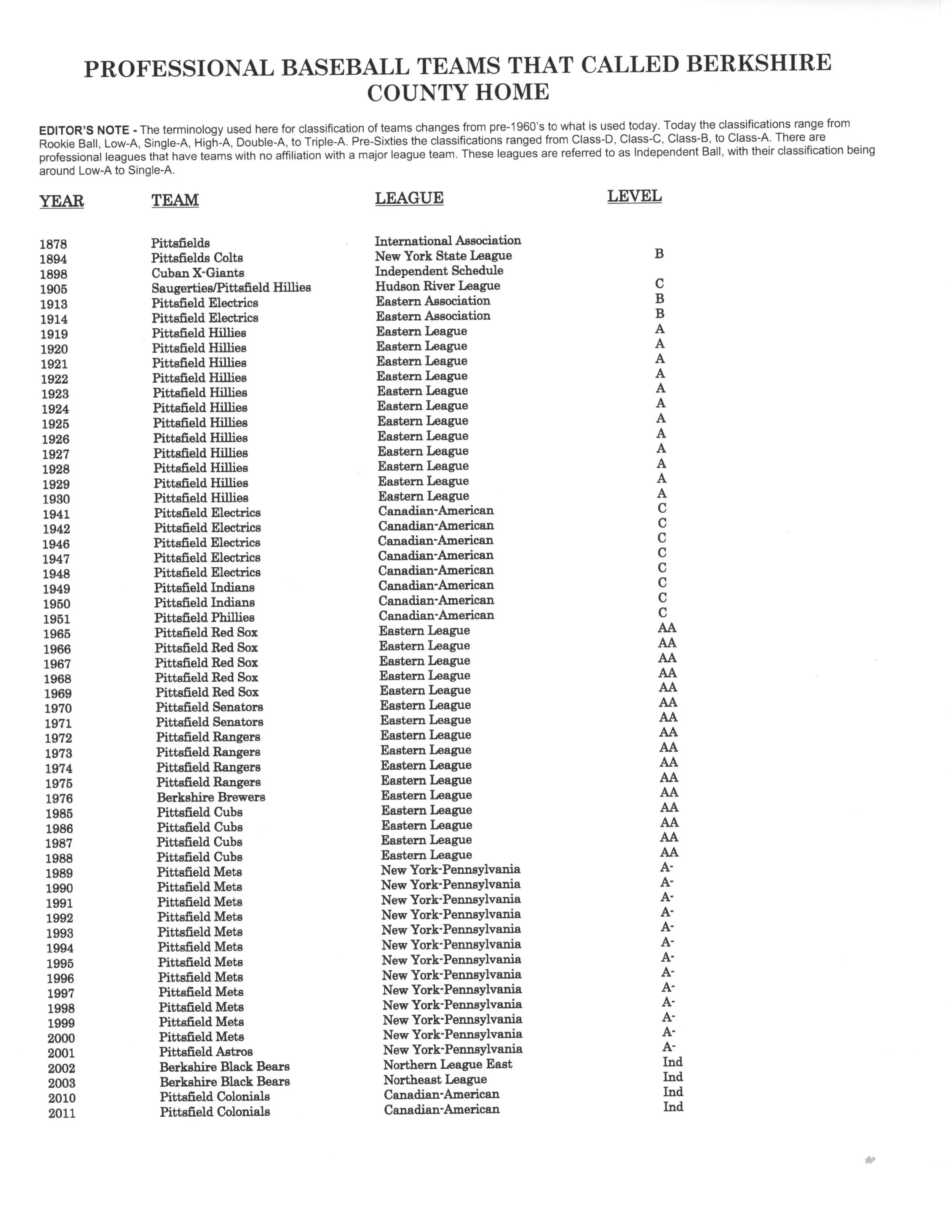 Berkshire County is really an “unknown” hotbed for professional baseball over the years. Besides the 41 professional major league players mentioned above there has been over 225 minor league players born, raised or settled here in Berkshire County.